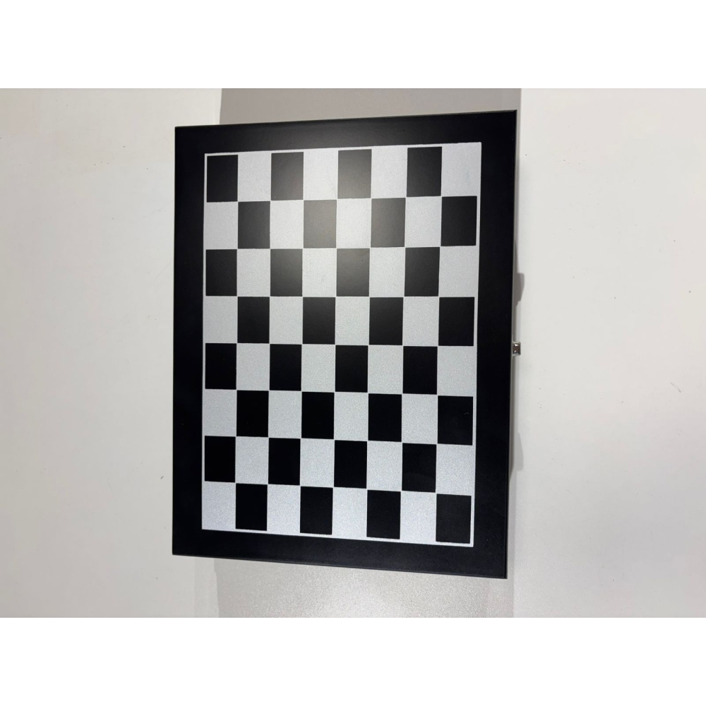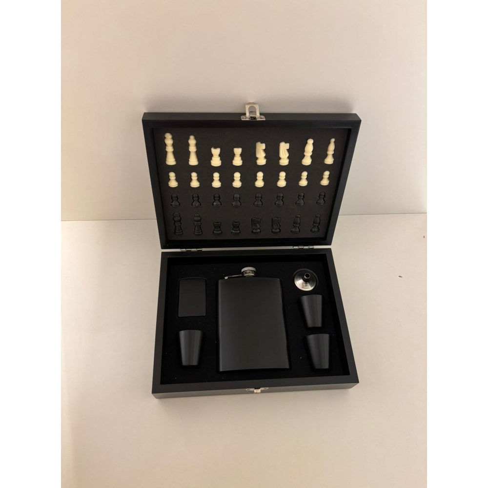 Kit de presente contendo uma caixa em mdf com tabuleiro de xadrez, peças completas para jogo xadrez, 1 cantil de bolso para wisky, 3 copos de uma dose e um funil.